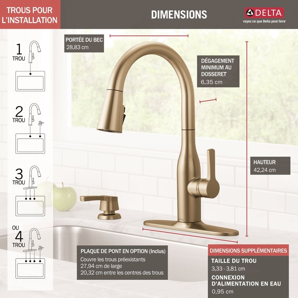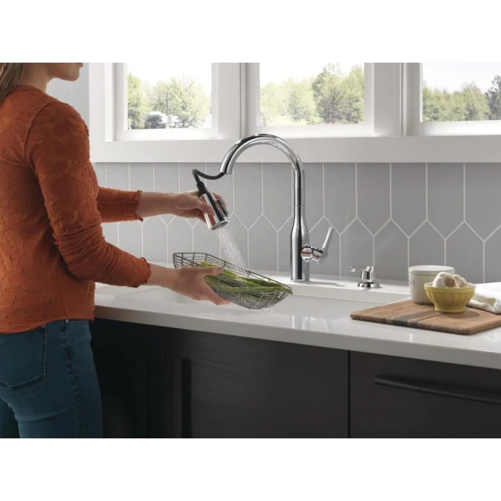 Delta MagnaTite Docking uses a powerful integrated magnet to pull your faucet spray wand precisely into place and hold it there so it stays docked when not in use. Delta ShieldSpray Technology cleans with laser-like precision while containing mess and splatter. A concentrated jet powers away stubborn messes while an innovative shield of water contains splatter and clears off the mess, so you can spend less time soaking, scrubbing, and shirt swapping. Delta faucets with DIAMOND Seal Technology perform like new for life with a patented design which reduces leak points, is less hassle to install and lasts twice as long as the industry standard. Kitchen faucets with Touch-Clean Spray Holes allow you to easily wipe away calcium and lime build-up with the touch of a finger. You can install with confidence, knowing that Delta faucets are backed by our Lifetime Limited Warranty. Industry standard is based on ASME A112.18.1 of 500,000 cycles.
